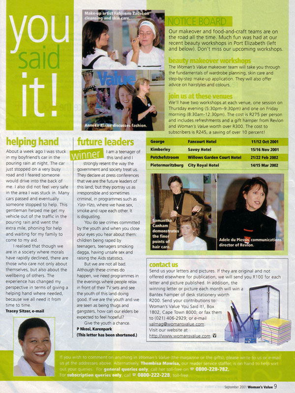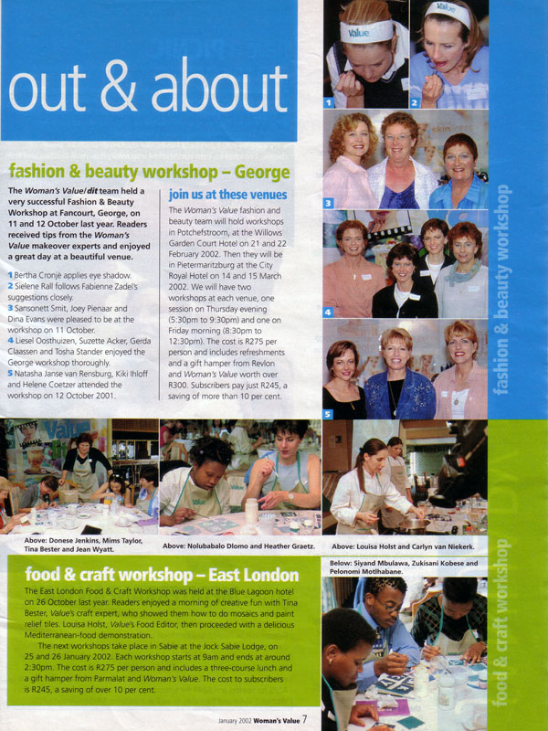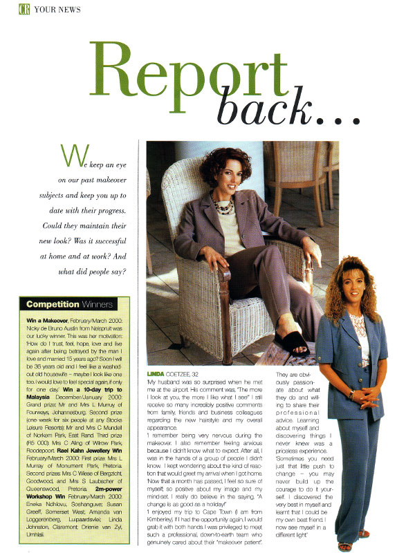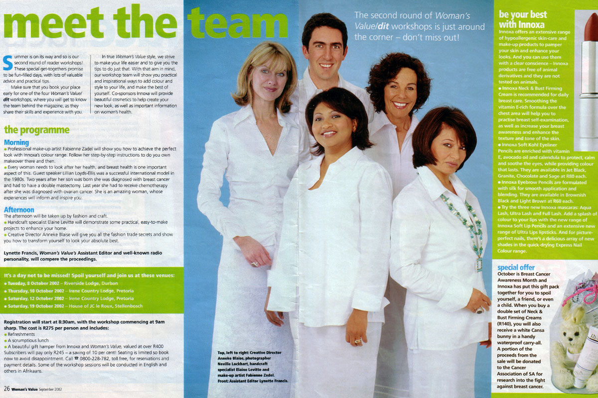 Due to her experience and personal style, Fabienne is often doing workshops and make overs. "Fabienne is always my first choice. Without much explaining on my behalf, she has the ability to visualize what I need in a shoot. Apart from her talent as hair and make up artist, she has a natural flair to know whether something will work or not. When in doubt during a shoot, I am comfortable knowing Fabienne is there to give some expert advice." Carla Nel Stylist Ideas Magazine |